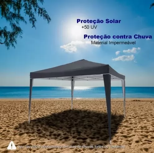 Tenda resistente, com PROTEÇÃO SOLAR +50 UV e APROVA D`AGUA muito fácil de montar com 3 alturas diferentes. Ideal para ser utilizada em praias, campos, jardins, camping, eventos, e diversas áreas abertas para a proteção contra o Sol e Chuva.